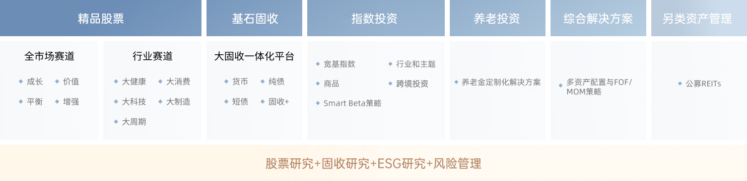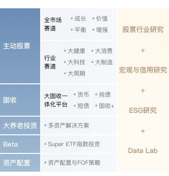 嘉實堅信只有更加聚焦的能力、更加深度的研究、基于成功經(jīng)驗的戰(zhàn)略升級,才能持續(xù)為客戶創(chuàng)造回報。發(fā)展至今,嘉實投研能力已覆蓋精品股票、基石固收、 Super ETF、ESG投資、資產(chǎn)配置五大投資能力,擁有超300人的投研團隊。