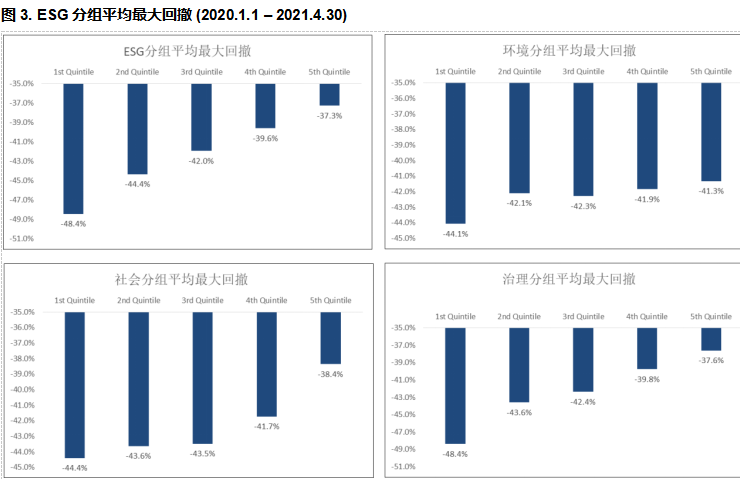 3) 我們按照期初行業(yè)中性ESG評(píng)分將樣本空間平均分為5組,第5組為評(píng)分最高組,第1組為評(píng)分最低組。而后,我們觀察不同ESG水平的組別在整個(gè)觀察期的平均收益率及回撤幅度,從而檢視ESG因子在疫情期間的表現(xiàn)。