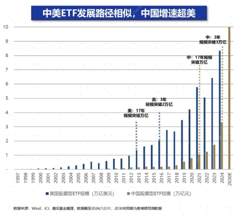 以權益類ETF為例,美國市場用17年突破萬億規(guī)模,又用了3年破第二個萬億,截至2024年末,美國ETF市場規(guī)模高達8萬億美元。中國市場同樣用17年實現(xiàn)首個萬億,但僅用3年便突破三萬億,增速遠超美國,發(fā)展勢頭迅猛,背后是多重因素合力推動。
