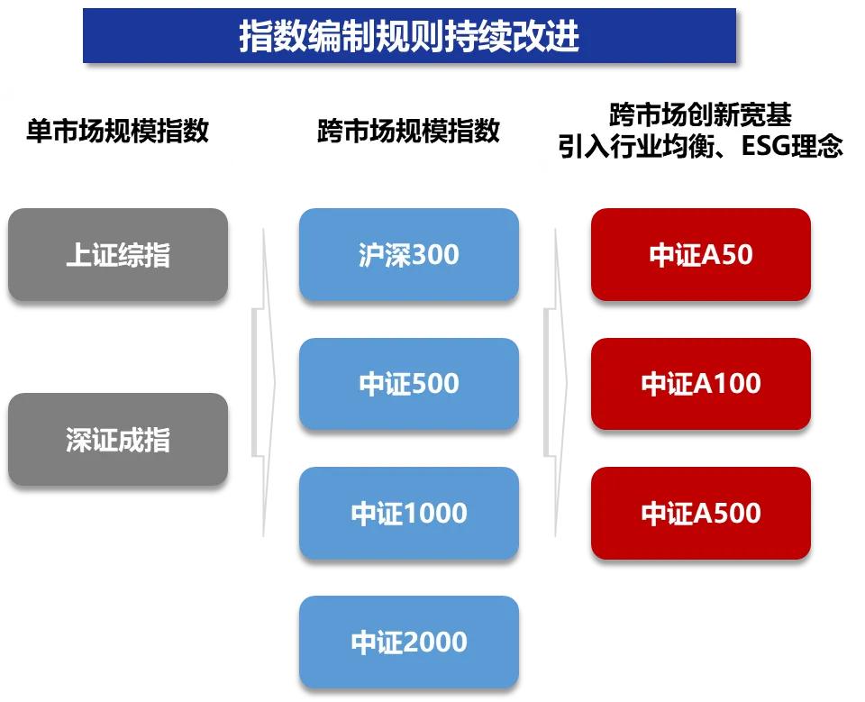 從最早的上證、深證單市場綜合指數(shù),到以滬深300、中證500為代表的規(guī)模寬基指數(shù),實現(xiàn)了對A股資產市值結構的全面表征,再到中證A500為核心的A系列創(chuàng)新寬基指數(shù),精選細分行業(yè)龍頭、兼顧行業(yè)均衡,并且引入國際先進的ESG投資理念,指數(shù)的表征性和深度投資價值進一步提升。