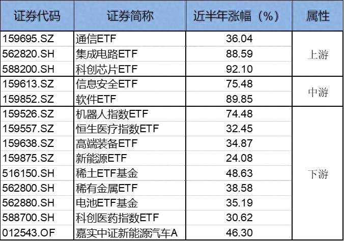 不止是單只產(chǎn)品的領(lǐng)先,嘉實(shí)基金在多個(gè)細(xì)分領(lǐng)域的產(chǎn)品簇也是頗為豐富。以今年大漲的科技賽道為例,從2023年初的ChatGPT引爆市場(chǎng),后續(xù)各種突破性創(chuàng)新作為催化劑,AI產(chǎn)業(yè)鏈的各個(gè)細(xì)分領(lǐng)域均展現(xiàn)出你方唱罷我登場(chǎng)的熱鬧格局。下圖為截至3月14日,近半年漲幅: