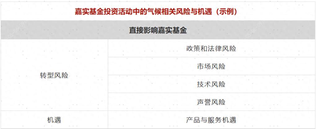 嘉實(shí)基金主要依據(jù)氣候相關(guān)財(cái)務(wù)信息披露工作組(TCFD)建議的框架,識(shí)別和評(píng)估氣候相關(guān)風(fēng)險(xiǎn)與機(jī)遇對(duì)標(biāo)的資產(chǎn)的影響,并基于中國(guó)氣候政策要求、產(chǎn)業(yè)結(jié)構(gòu)和市場(chǎng)發(fā)展階段進(jìn)行本土化調(diào)整和落地。