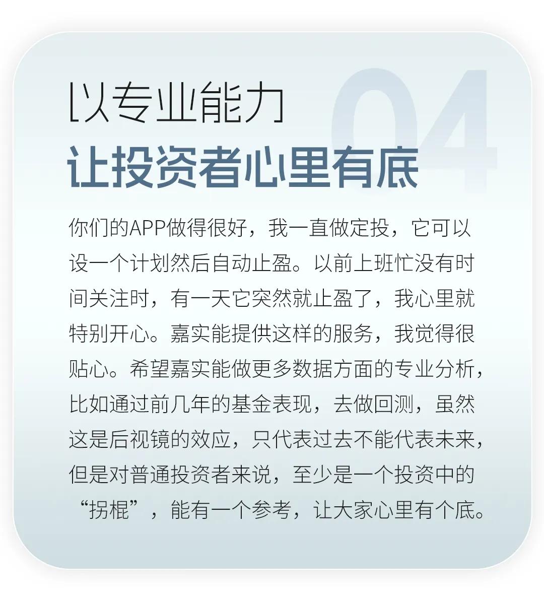 服務(wù)財富增長,助力產(chǎn)業(yè)騰飛。嘉實致力于成為中國領(lǐng)先,具有國際競爭力的資產(chǎn)管理集團(tuán) 認(rèn)識嘉實 |