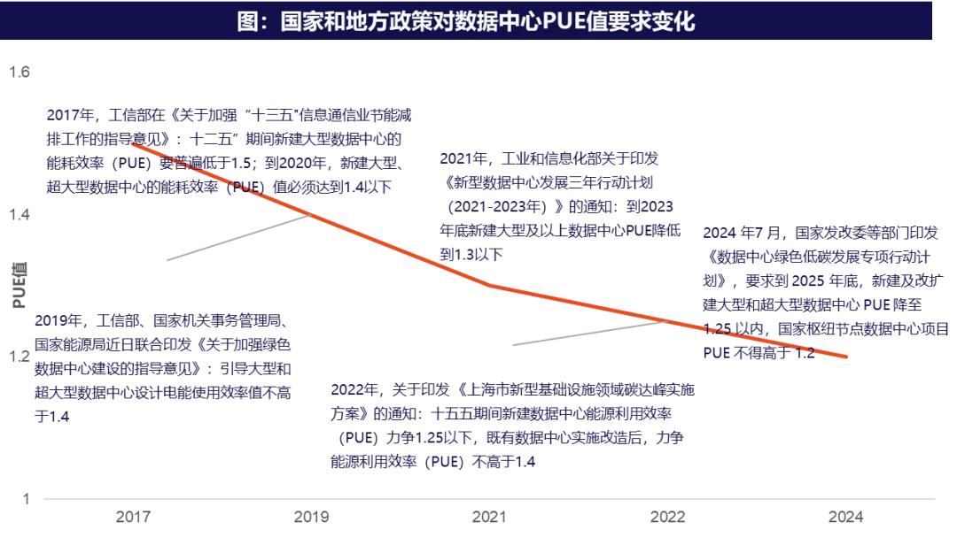 用電側(cè)的節(jié)能提效是數(shù)據(jù)中心低碳轉(zhuǎn)型的首要抓手,而降低電能利用效率(PUE)是短期內(nèi)最直接的路徑。PUE是數(shù)據(jù)中心總能耗與IT設(shè)備能耗的比值,數(shù)值越接近1,能效越高。政策層面已明確對(duì) PUE 的硬性約束:北京、上海、廣東等算力熱點(diǎn)地區(qū)此前出臺(tái)數(shù)據(jù)中心建設(shè)及升級(jí)改造要求,其中北京要求新建數(shù)據(jù)中心PUE準(zhǔn)入值達(dá)到1.2,上海規(guī)定新建數(shù)據(jù)中心PUE不高于1.25。這一政策導(dǎo)向下,能效偏低的項(xiàng)目正逐步被淘汰,高能效數(shù)據(jù)中心在行業(yè)準(zhǔn)入與運(yùn)營成本上的優(yōu)勢愈發(fā)顯著。