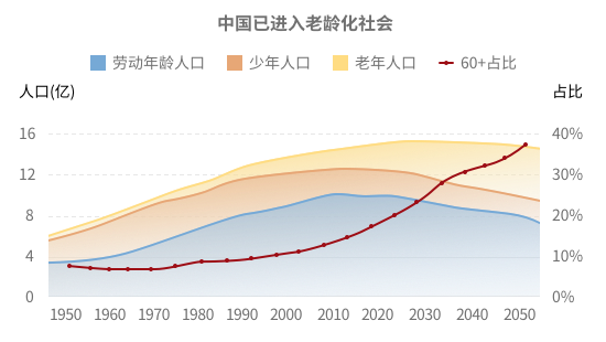 預(yù)計(jì)到2050年,我國(guó)60+人口將達(dá)到35%左右,老齡化壓力大。